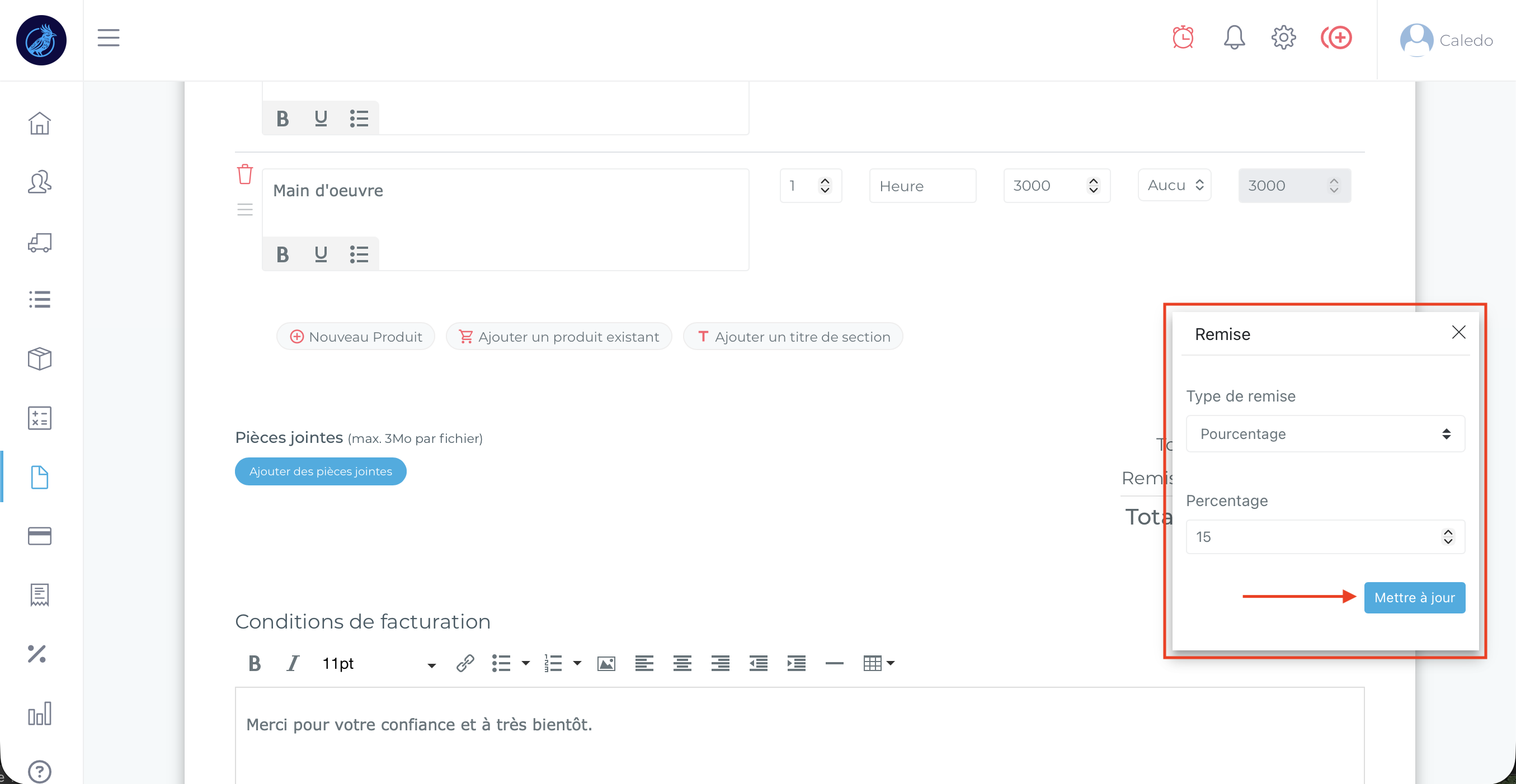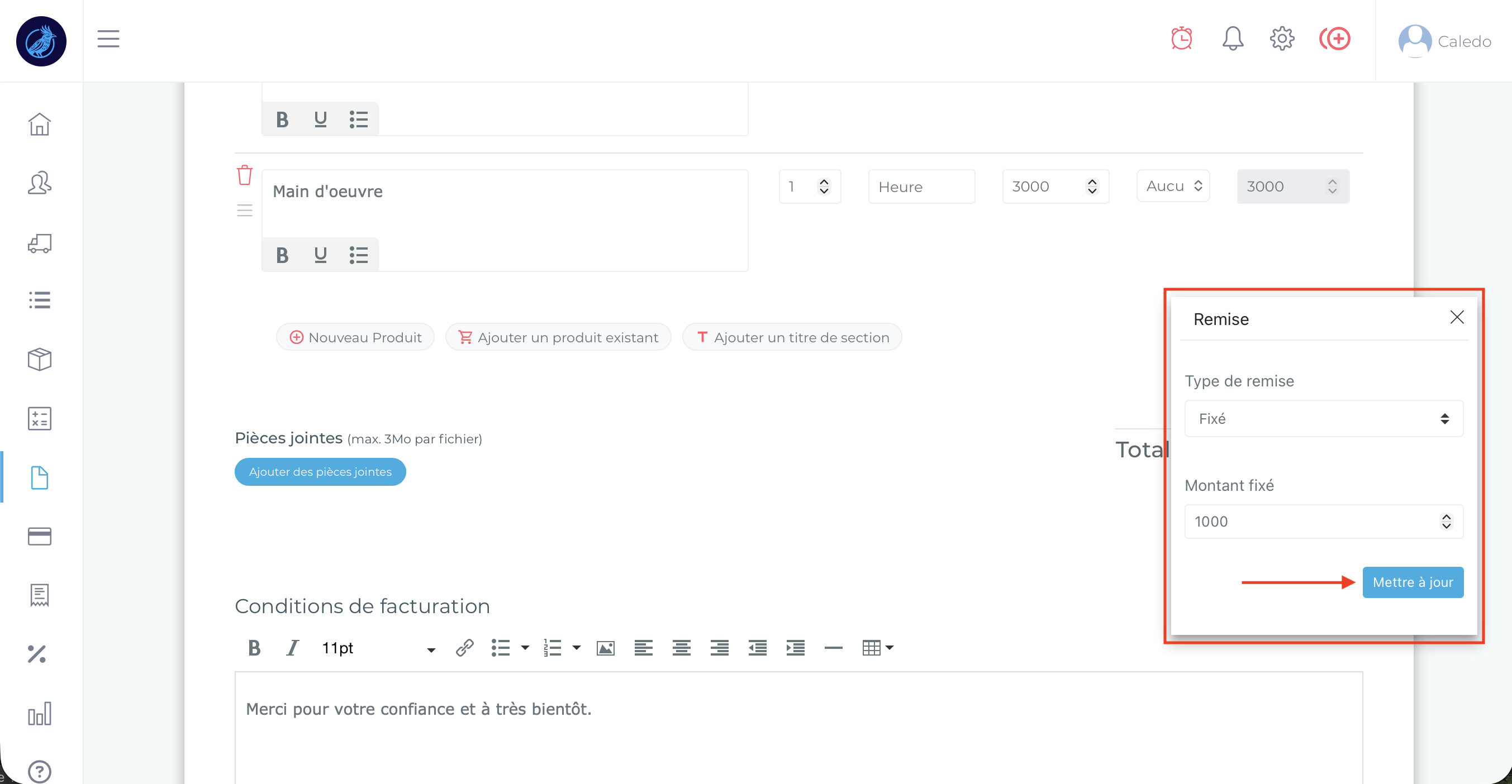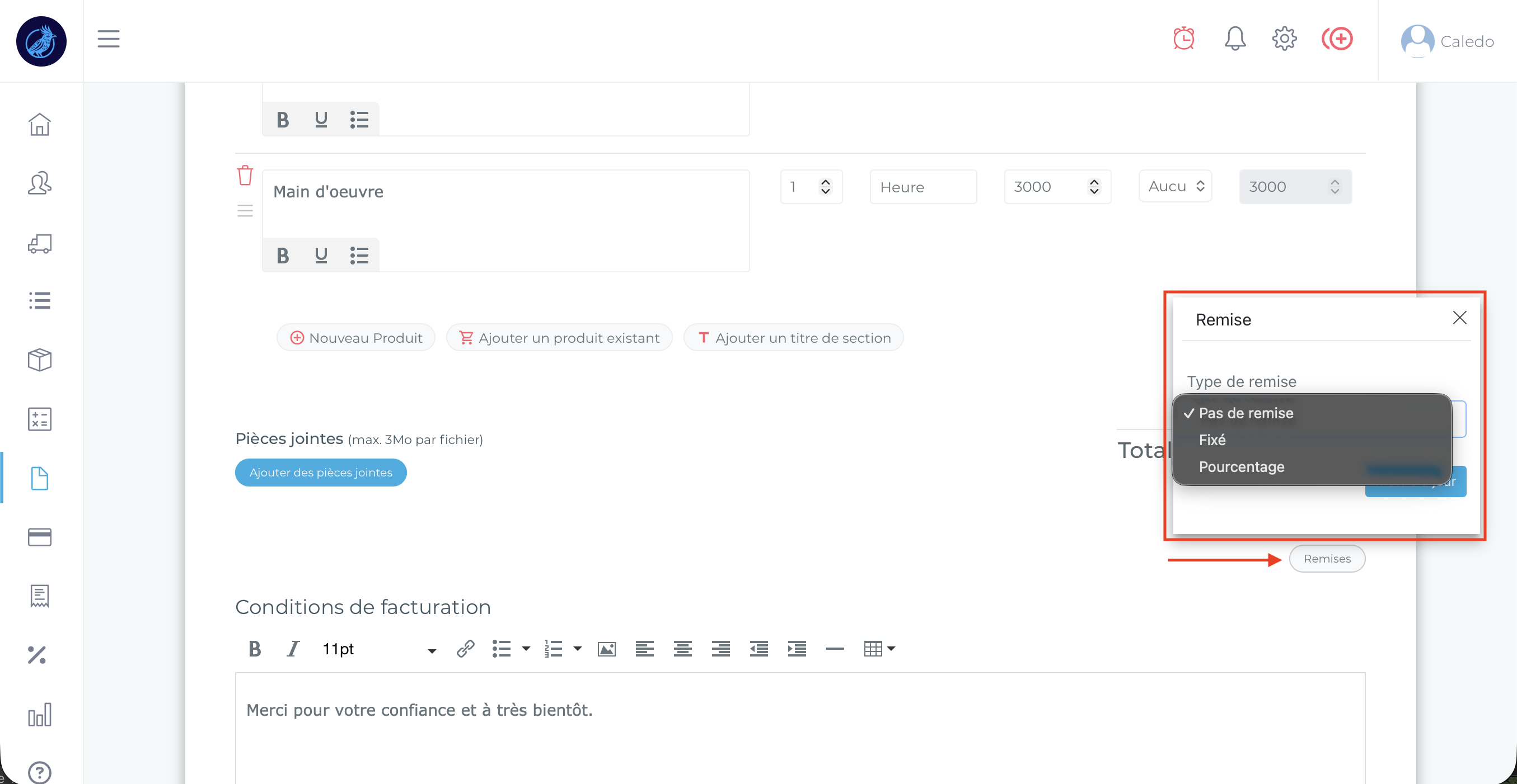 Vous trouverez ici toutes les informations pour ajouter une remise sur une facture depuis votre interface Caledo Compta :