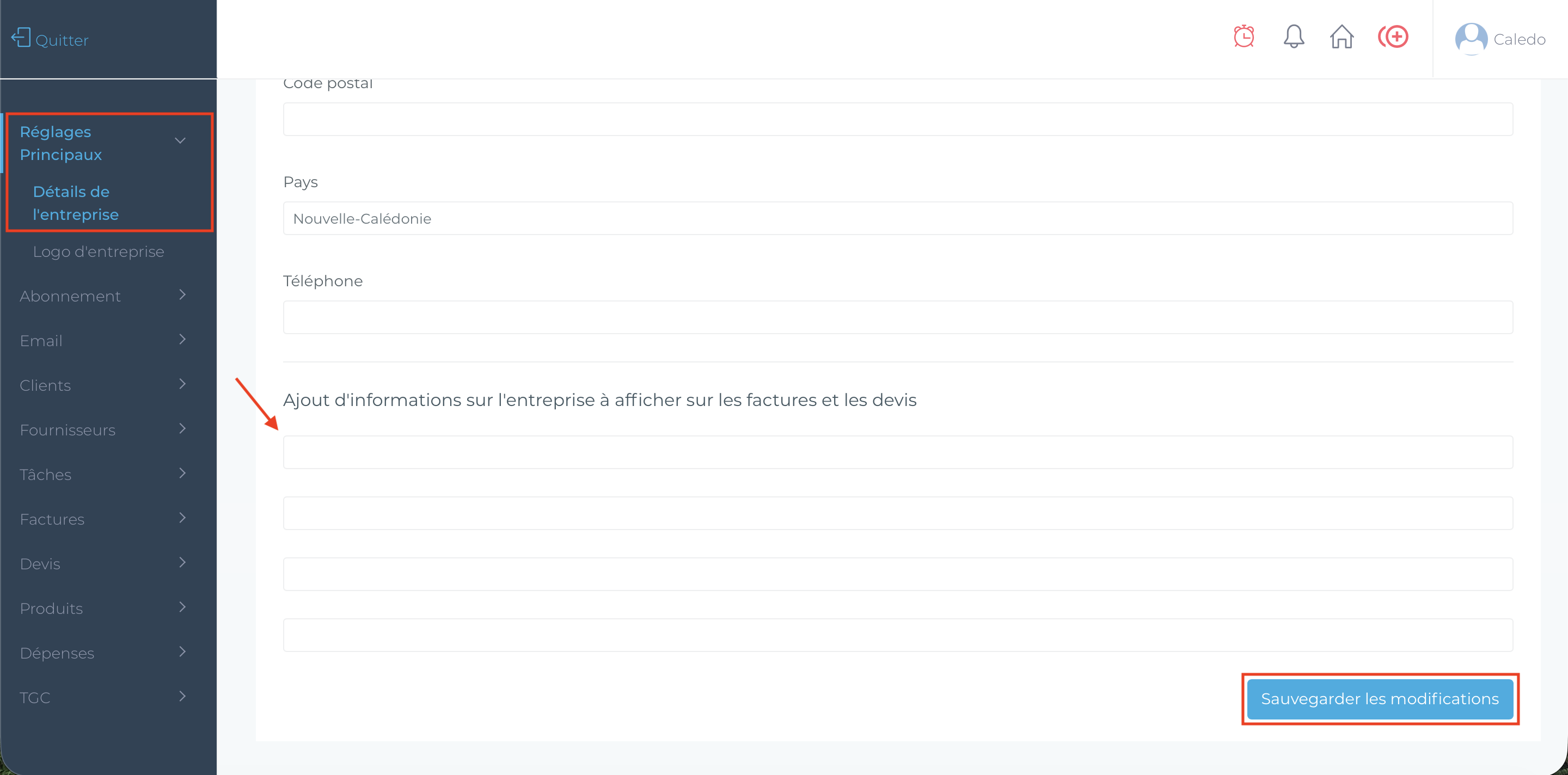 - Remplissez les informations des coordonnées de l’entreprise. Vous pouvez aussi ajouter des informations que vous souhaitez voir apparaitre sur les devis et factures.