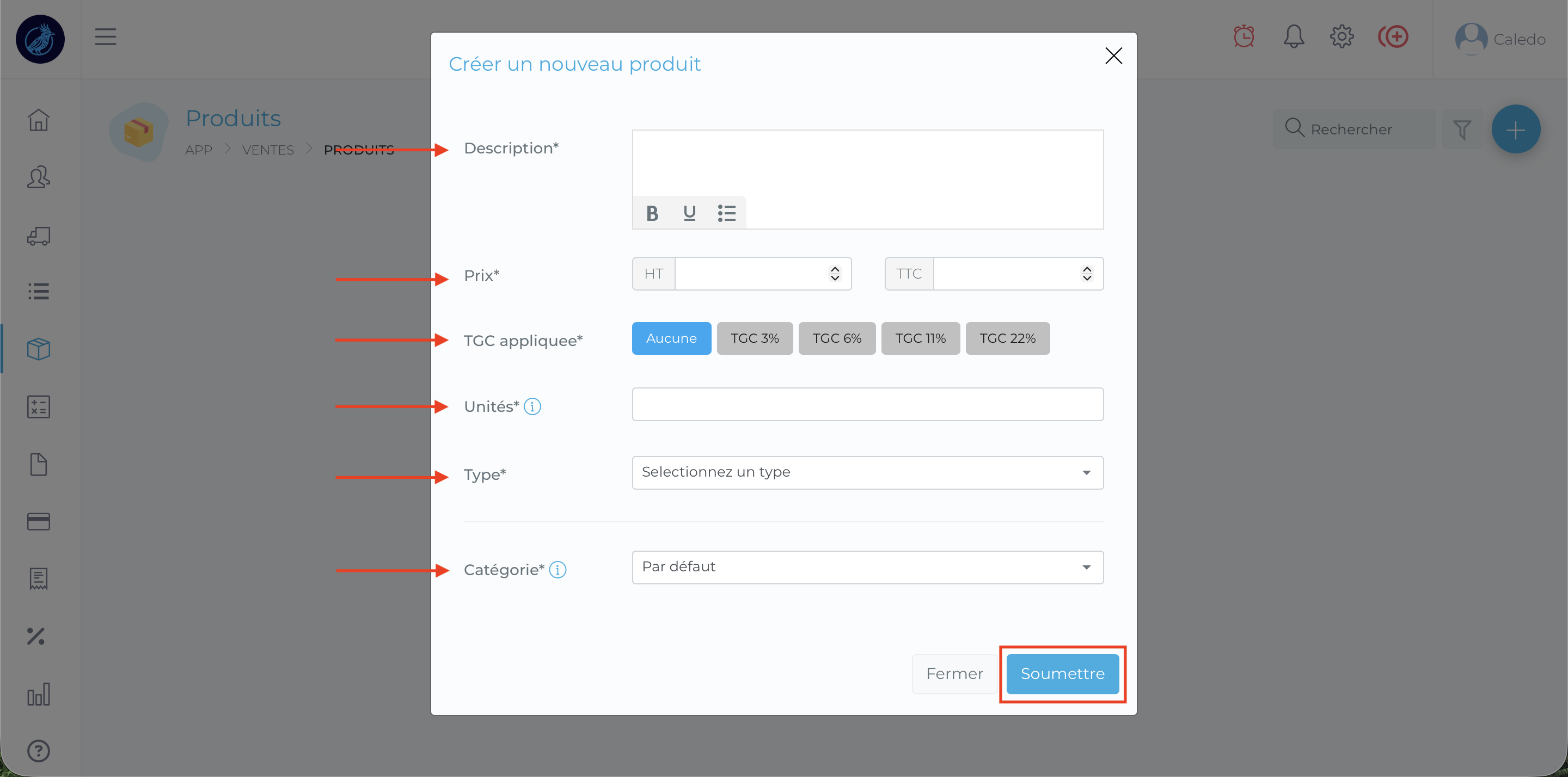 Vous trouverez ici toutes les informations pour créer un produit depuis ton compte Caledo Compta :