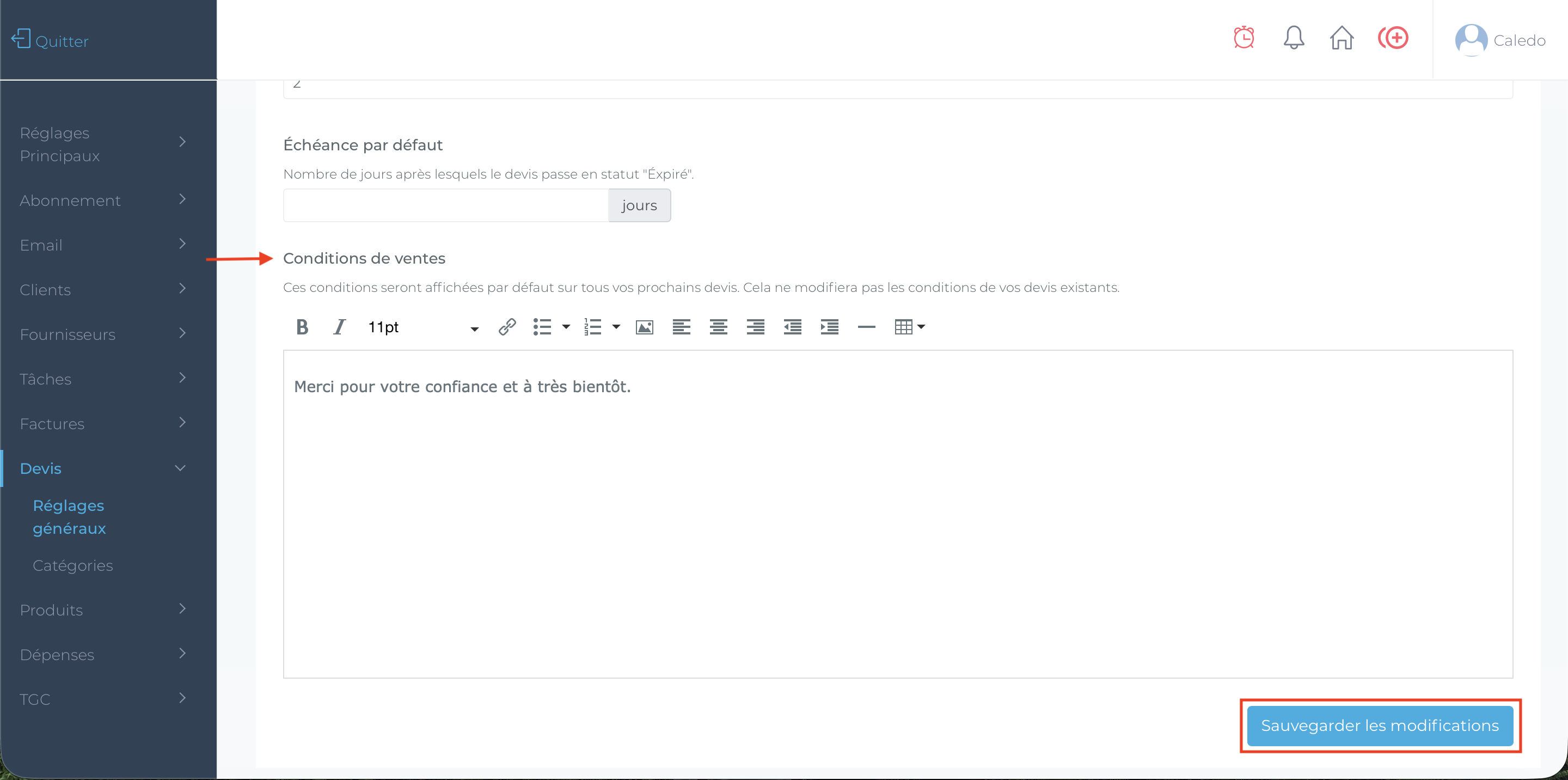 CONDITIONS DE VENTE : Vous avez une zone texte pour personnaliser vos conditions de vente. Ces conditions apparaîtront sur tous vos devis. Attention, cela ne modifiera pas les conditions de ventes de vos devis déjà existants.