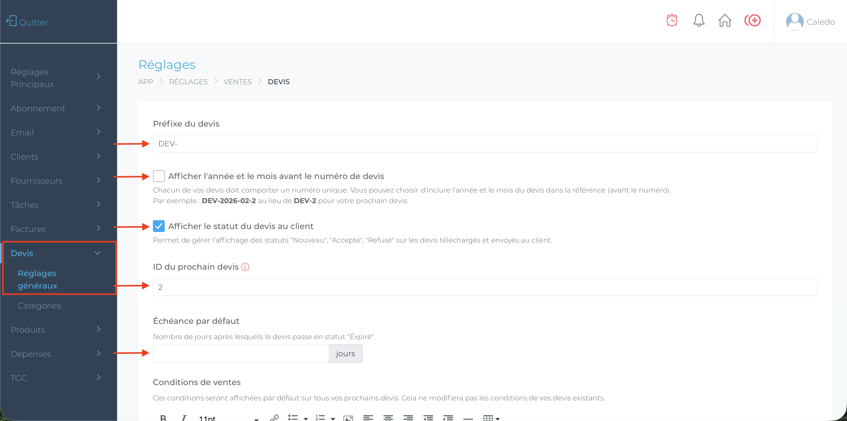 Vous trouverez ici toutes les informations concernant les réglages des devis à configurer sur votre compte Caledo Compta :